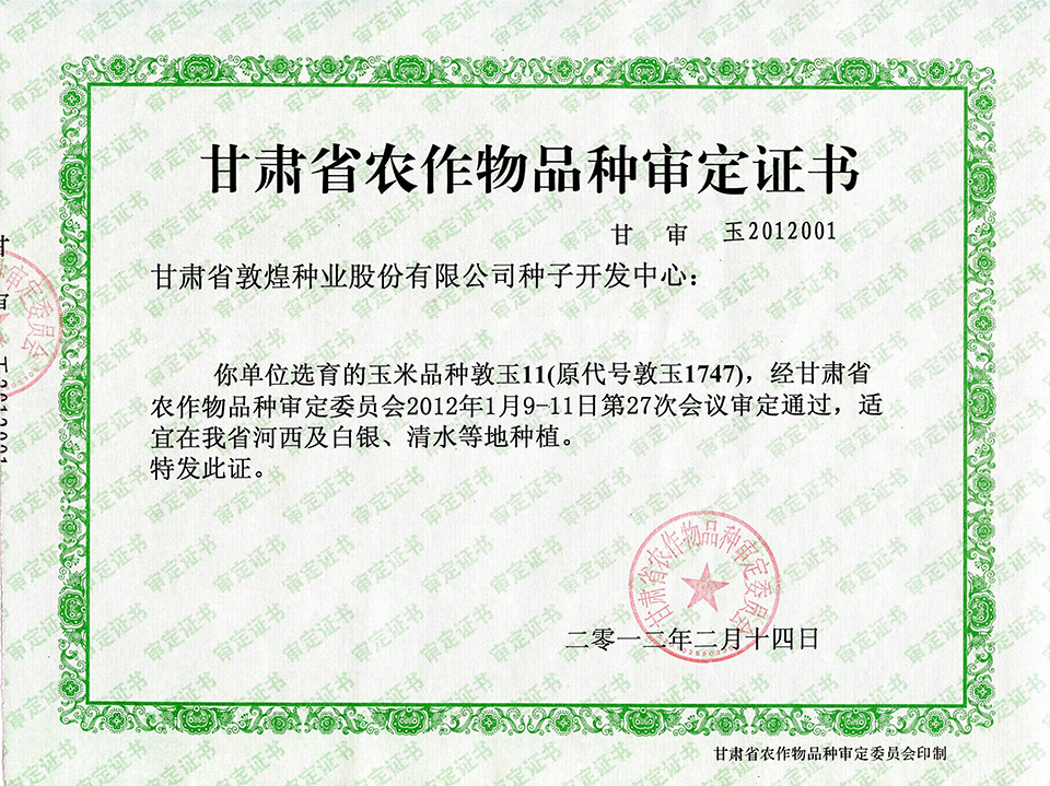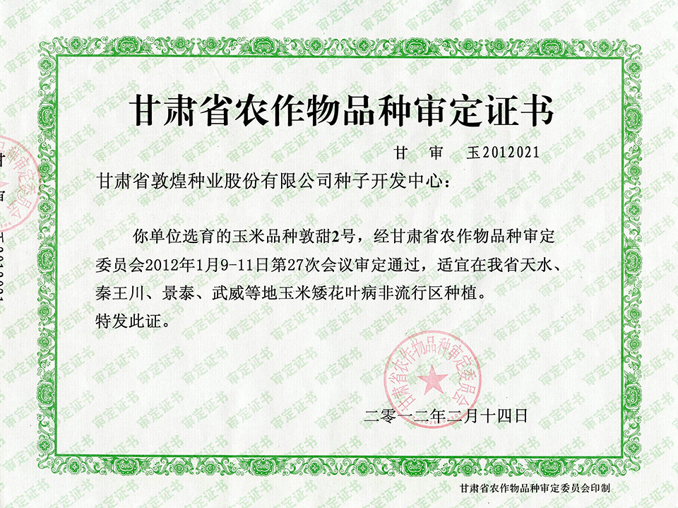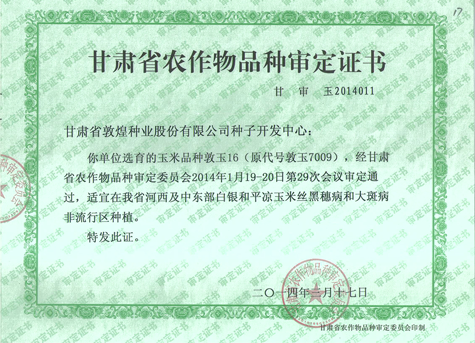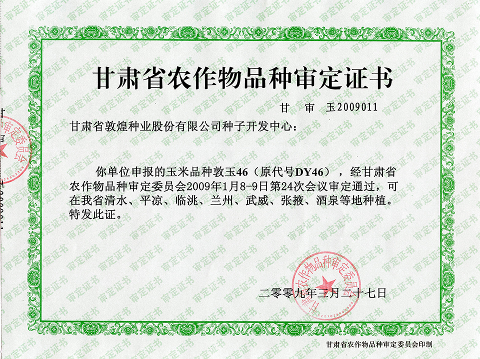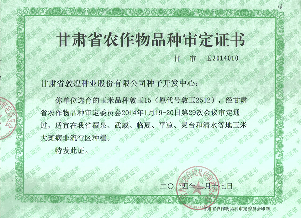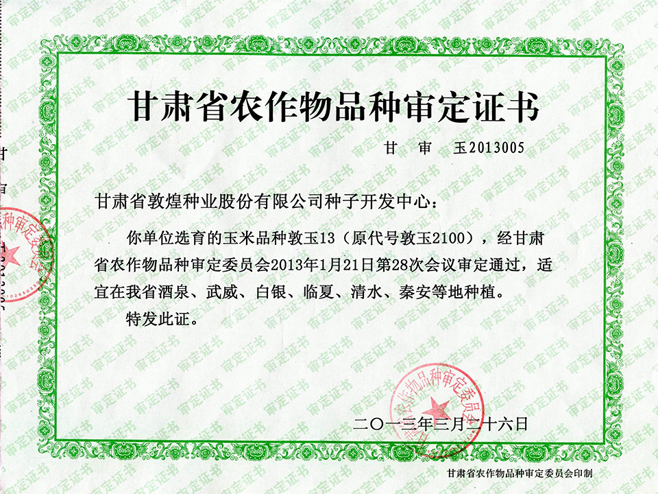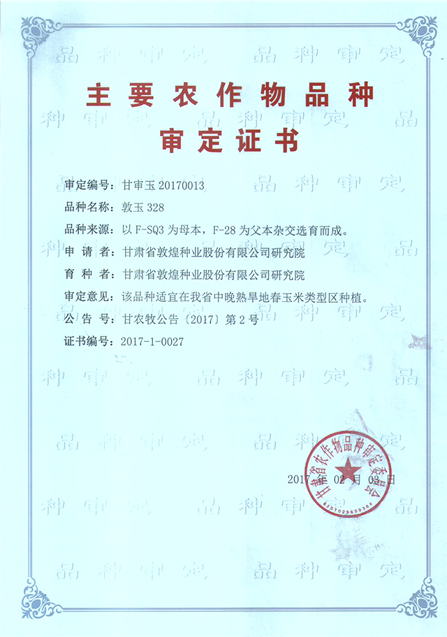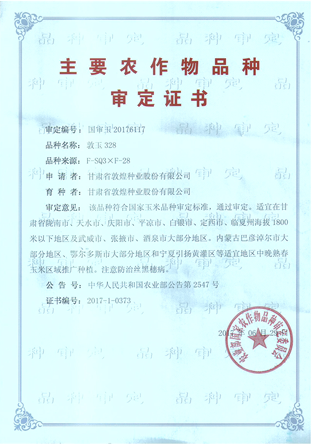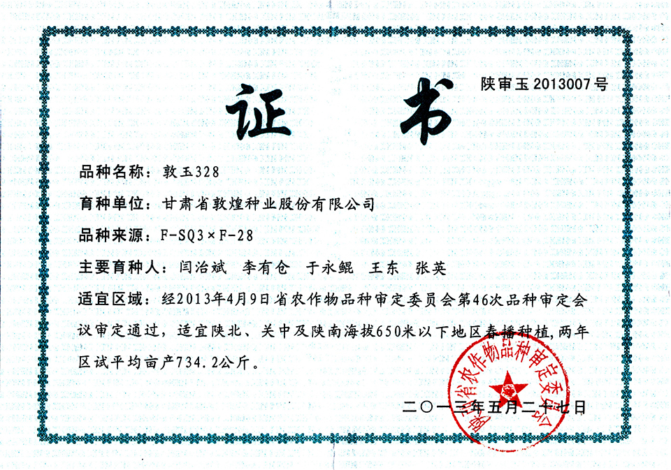 敦玉328品種審定證書(shū)(甘肅)