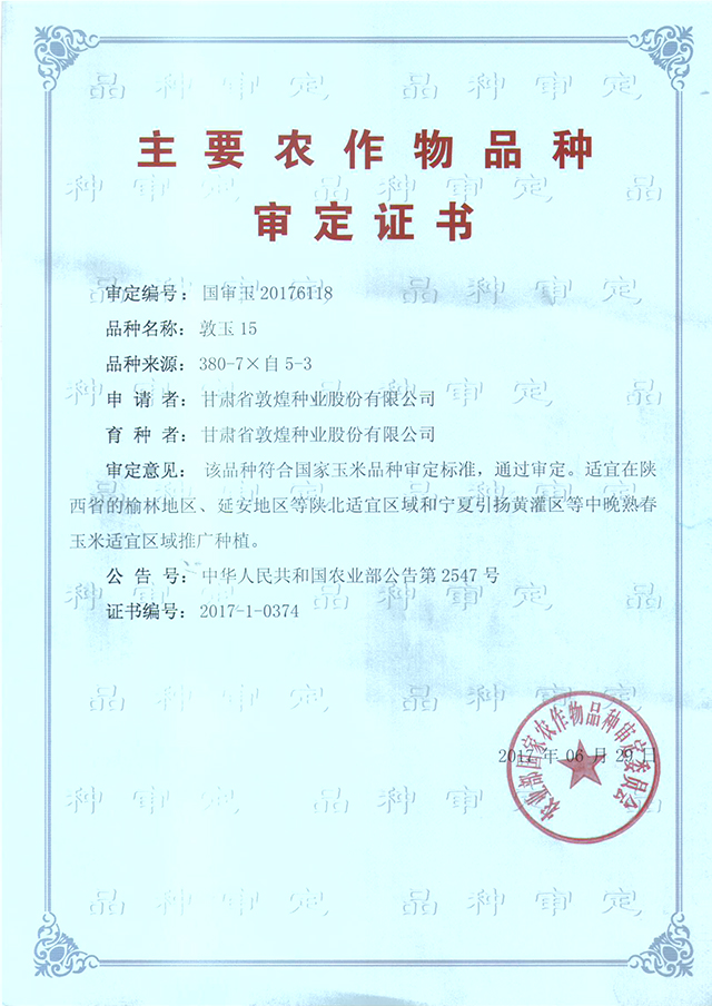 敦玉15品種審定證書(shū)(國(guó)家)